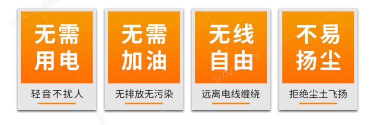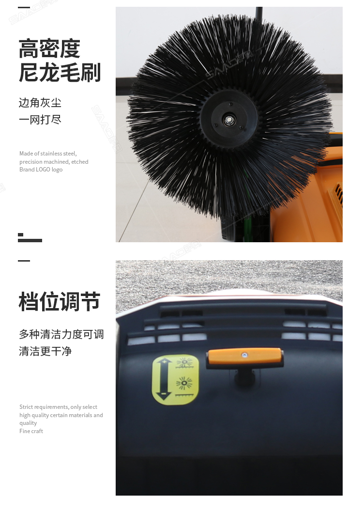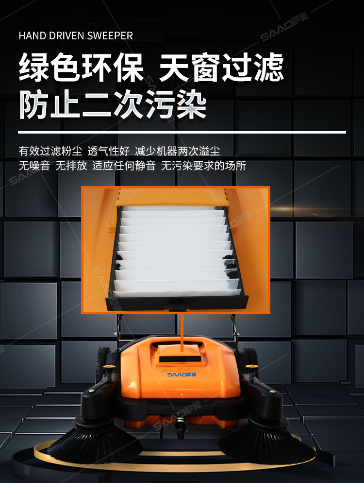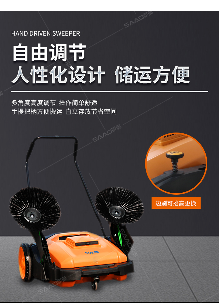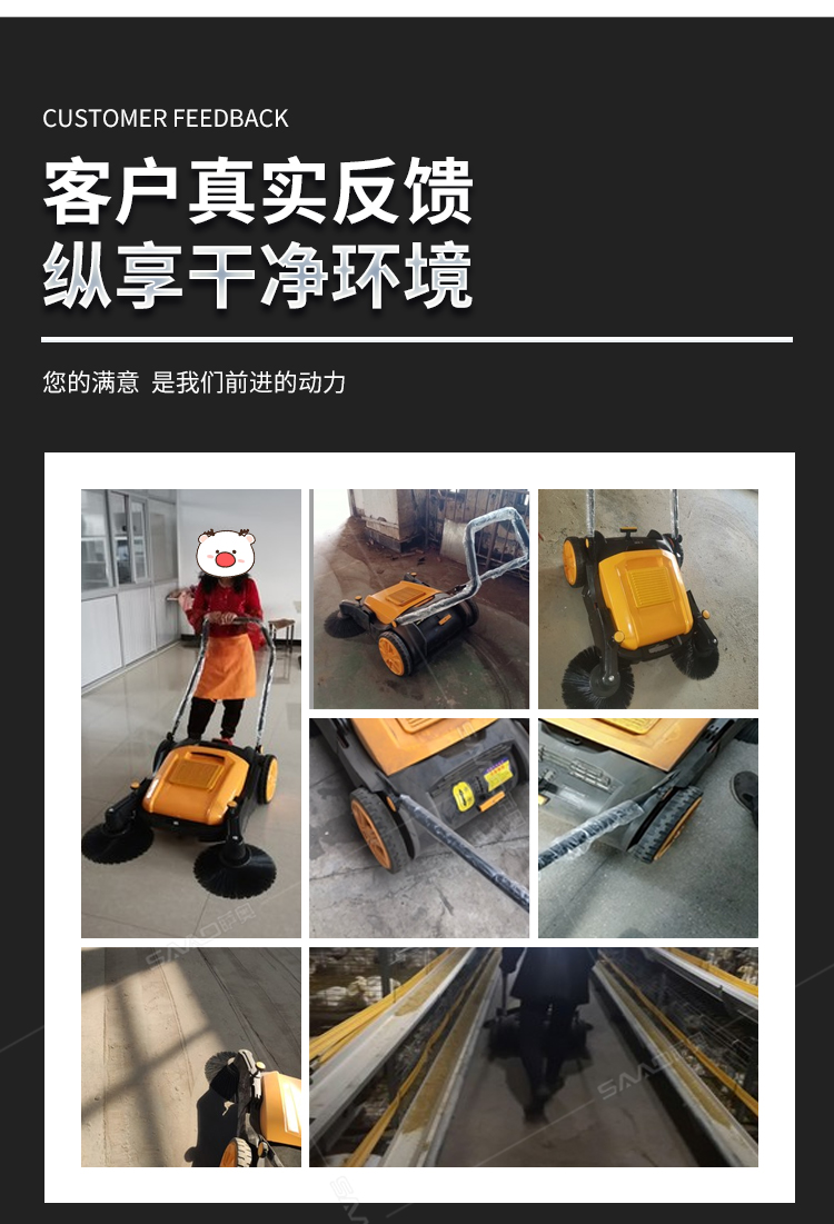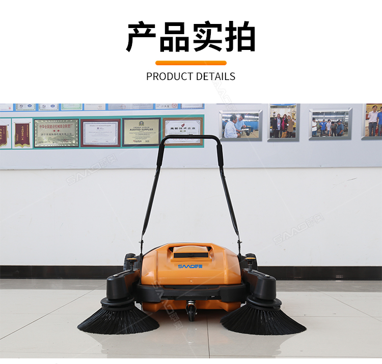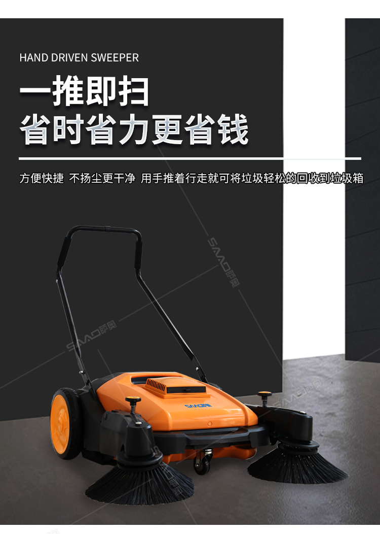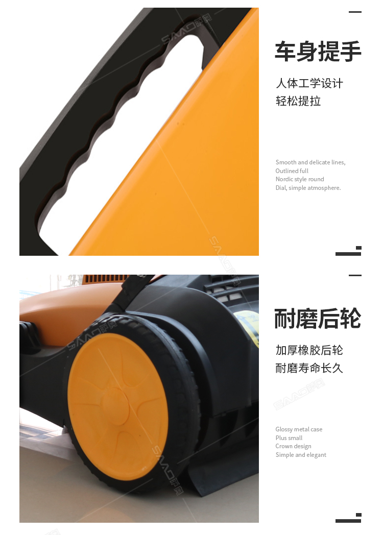 手推式掃地機(jī)能清潔房屋周邊范圍:包括小路,公路,車道和院子,能比用普通的掃把和簸箕節(jié)省5倍的時(shí)間,清掃時(shí)垃圾被迅速的收集到塵箱,簡(jiǎn)單、快速、干凈。