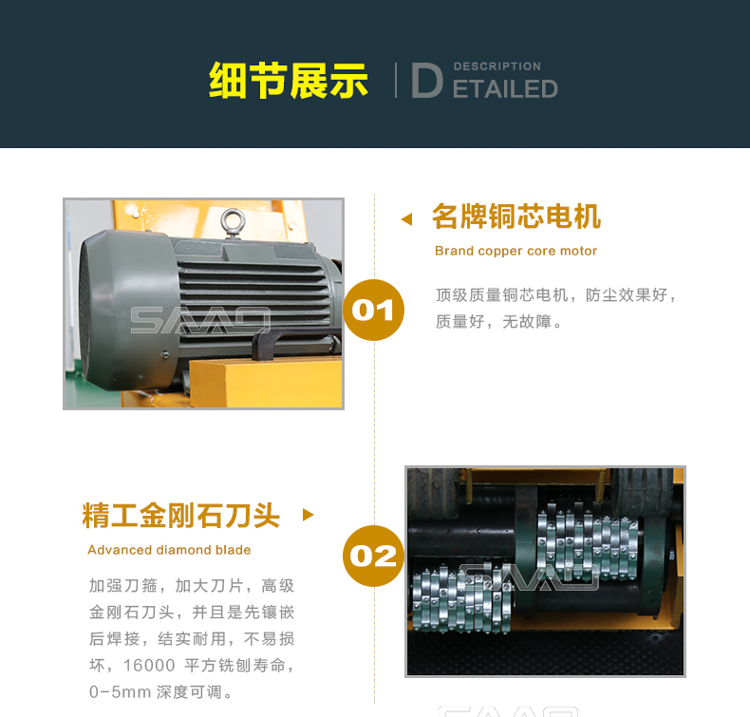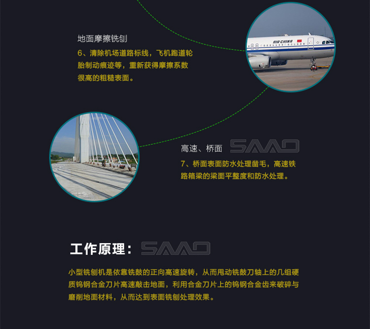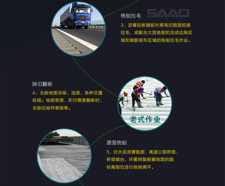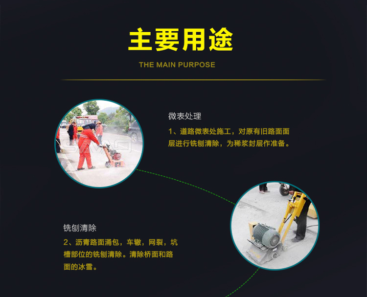 用于橋面鋪設(shè)瀝青或車間舊的混凝土地面重新攤鋪混凝土之前,清除水泥浮漿以及鏟平拉毛,也用于清除建筑施工中遺留的堅硬灰渣。
