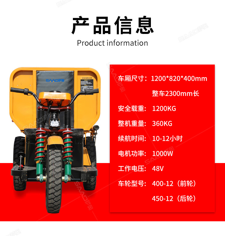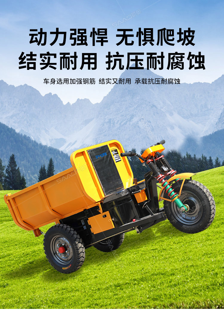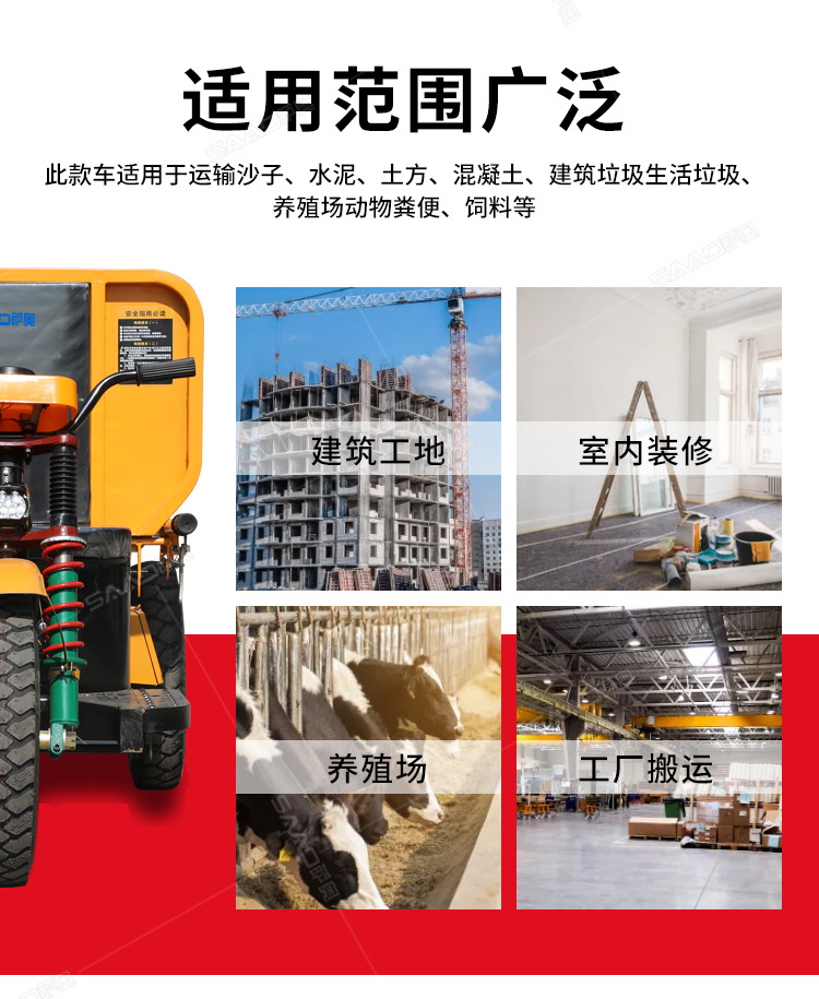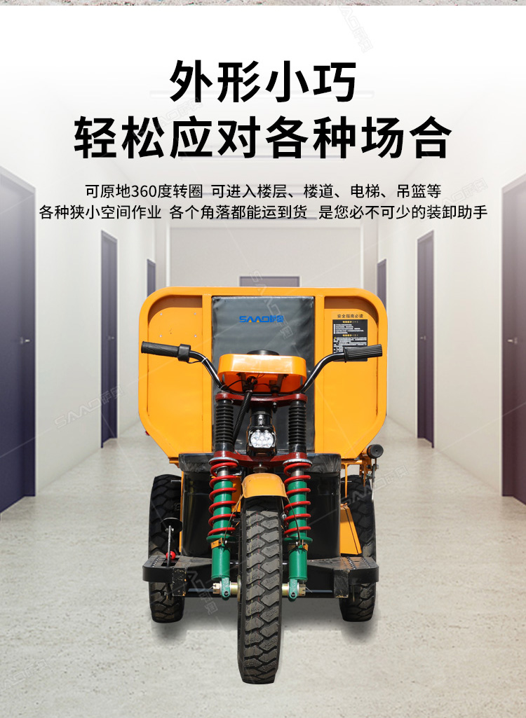 此款車(chē)適用于建筑工地、室內(nèi)裝修、養(yǎng)殖場(chǎng)、工廠等場(chǎng)所,運(yùn)輸沙子、水泥、土方、混凝土、建筑垃圾生活垃圾、養(yǎng)殖場(chǎng)動(dòng)物糞便、飼料等,體積小操作簡(jiǎn)單靈活,可原地360度轉(zhuǎn)圈,可