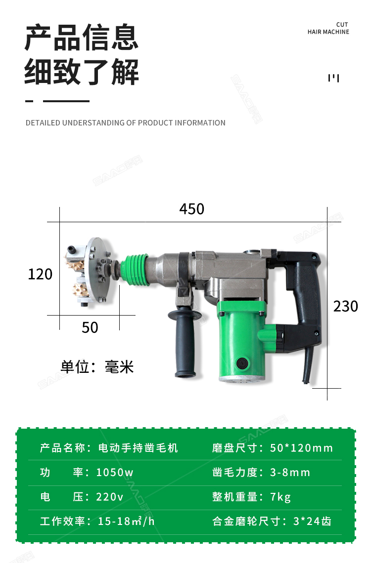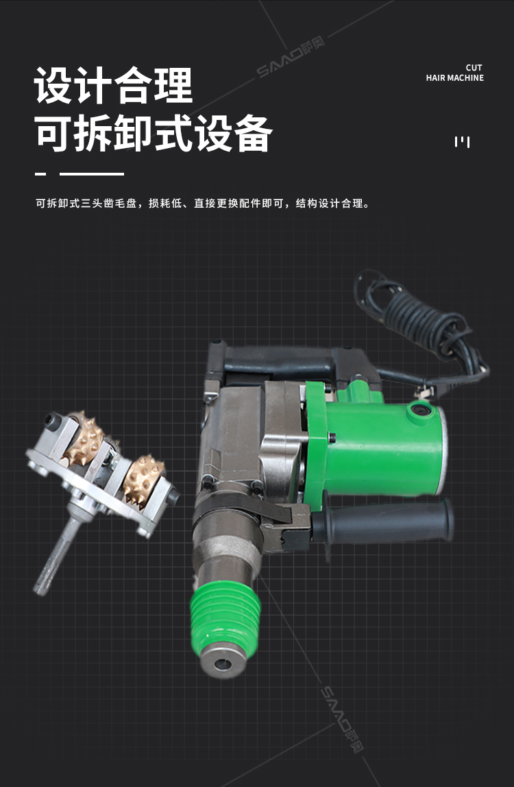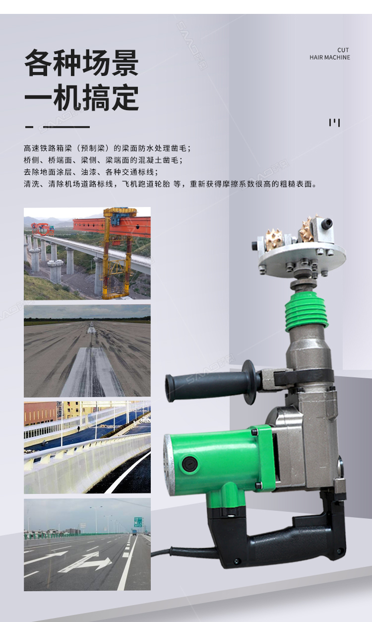 電動手持式鑿毛機 金剛石三頭鑿毛設(shè)備 小型水泥路面拉毛機 功率:1050w 工作效率:15-18㎡/h 電壓:220v 磨盤尺寸:50*120mm 合金磨輪尺寸:3*24齒 鑿毛深度:3-8mm 整機重量:7kg
