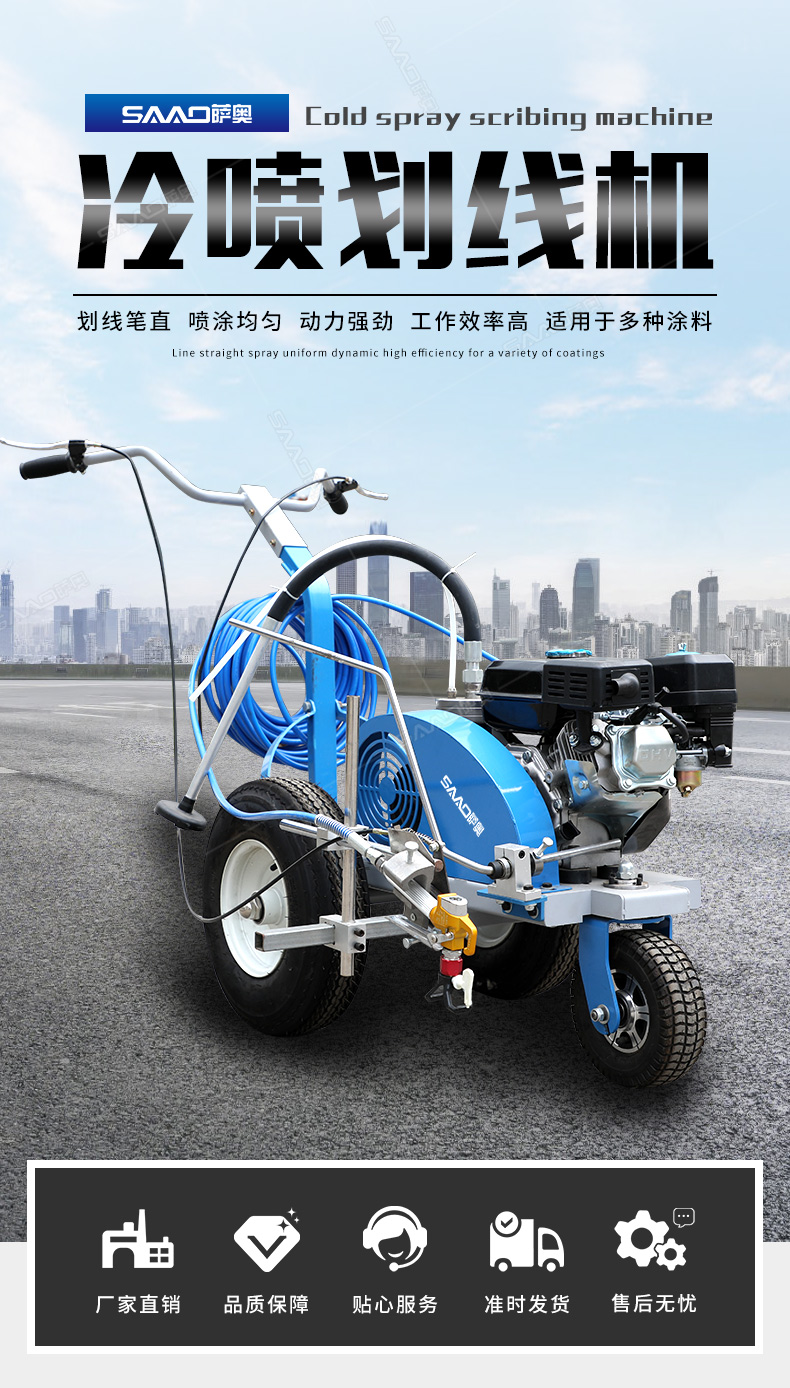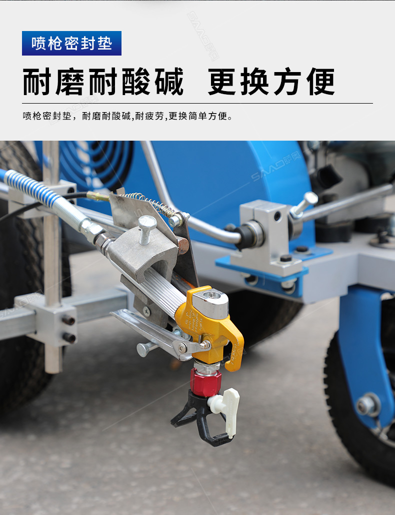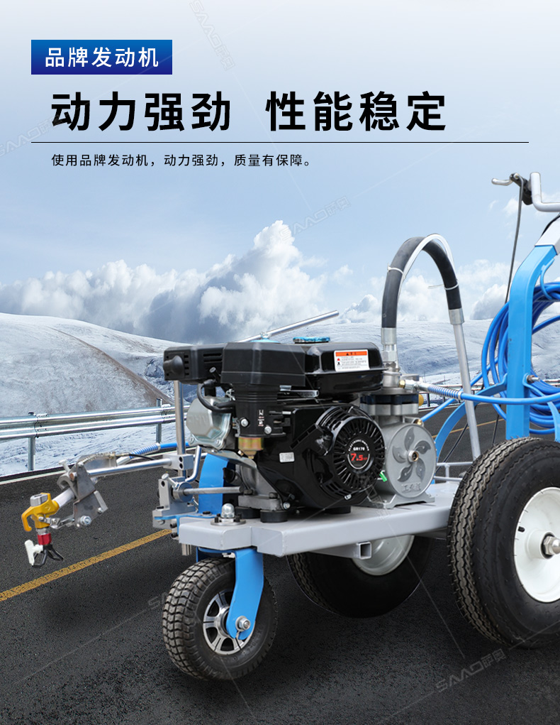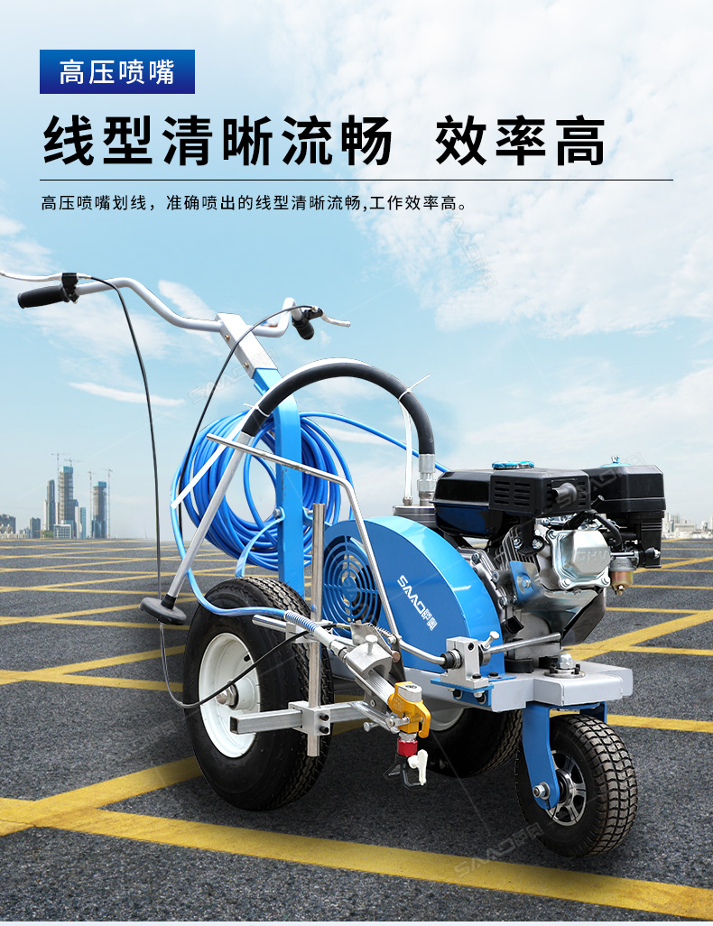 主要用于公路、市區(qū)、停車場、機(jī)場等涂劃直線、虛線、曲線、文字、箭頭等。具有劃線效果好、速度快、效率高、適用范圍廣、使用方便等優(yōu)點(diǎn)。 【優(yōu)勢特點(diǎn)】 1.高壓噴嘴劃線,準(zhǔn)確