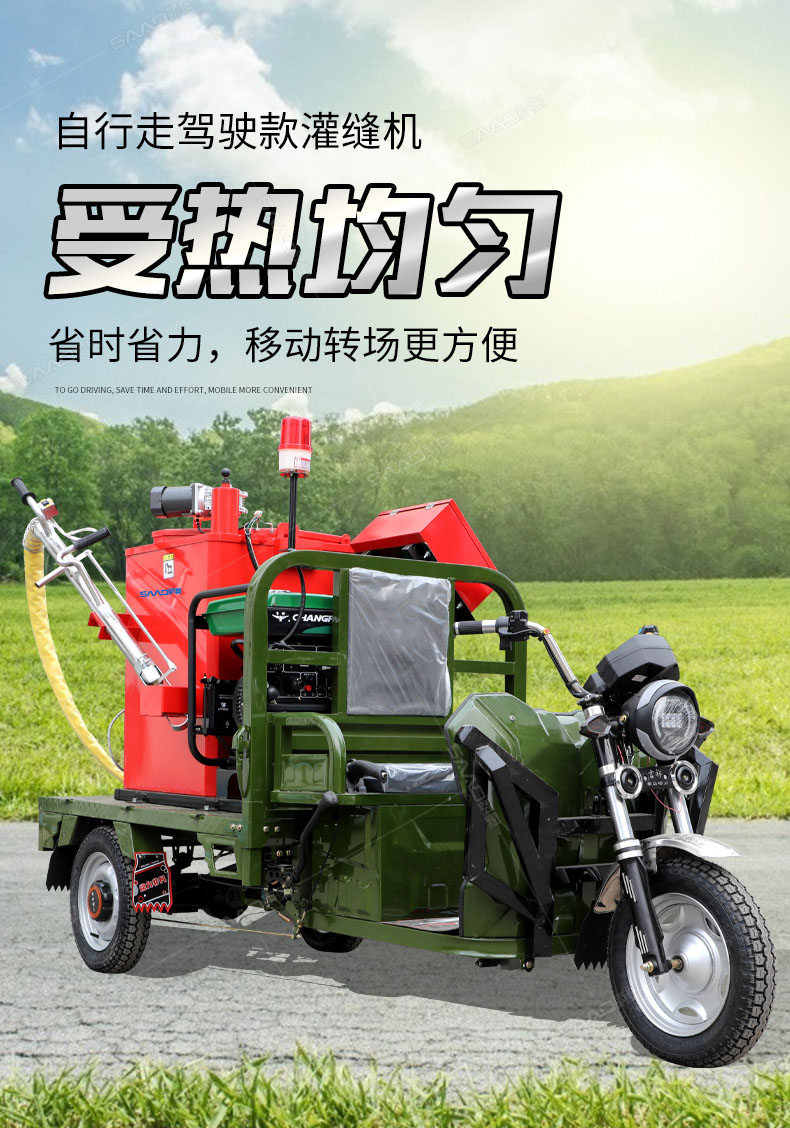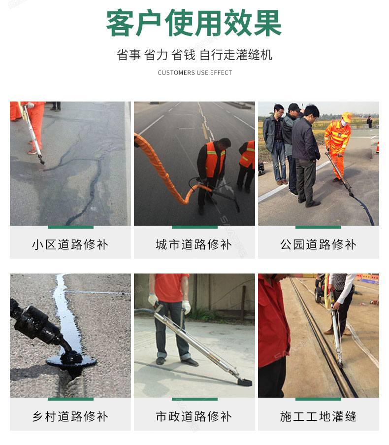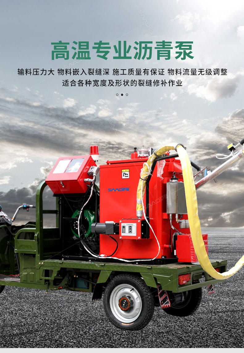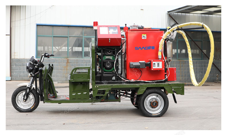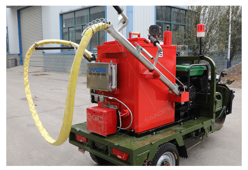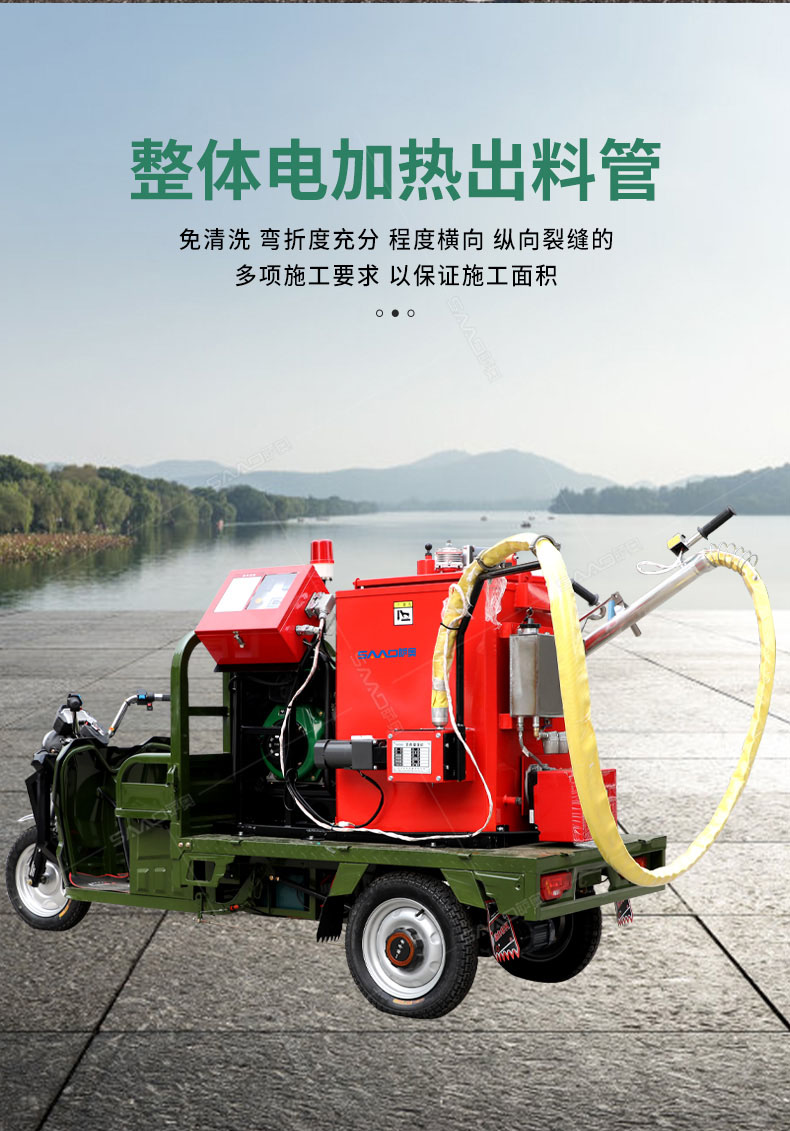 汽油灌縫機主要有手推式和自行式手持灌縫管操作,采用進口柴油燃燒器加熱。在工作時首先在料箱內加入瀝青或灌縫膠,啟動發(fā)電機供電,依次間斷打開導熱油泵開關,燃燒器開關,出料管加熱開關;調整自動溫控系統(tǒng)與材料的溫度相同,通過柴油燃燒器自動加熱熔料箱內導熱油開始升溫(拖式為強制循環(huán))使材料融化,溫度是通過自控系統(tǒng)來控制。溶料時間大約30-40分鐘左右。在材料融化、出料管溫度達到后可以進行工作。手持灌縫管對正裂縫灌縫處理。瀝青泵的出料流量可調。在工作過程中隨時添加材料保證工作的連續(xù)性。