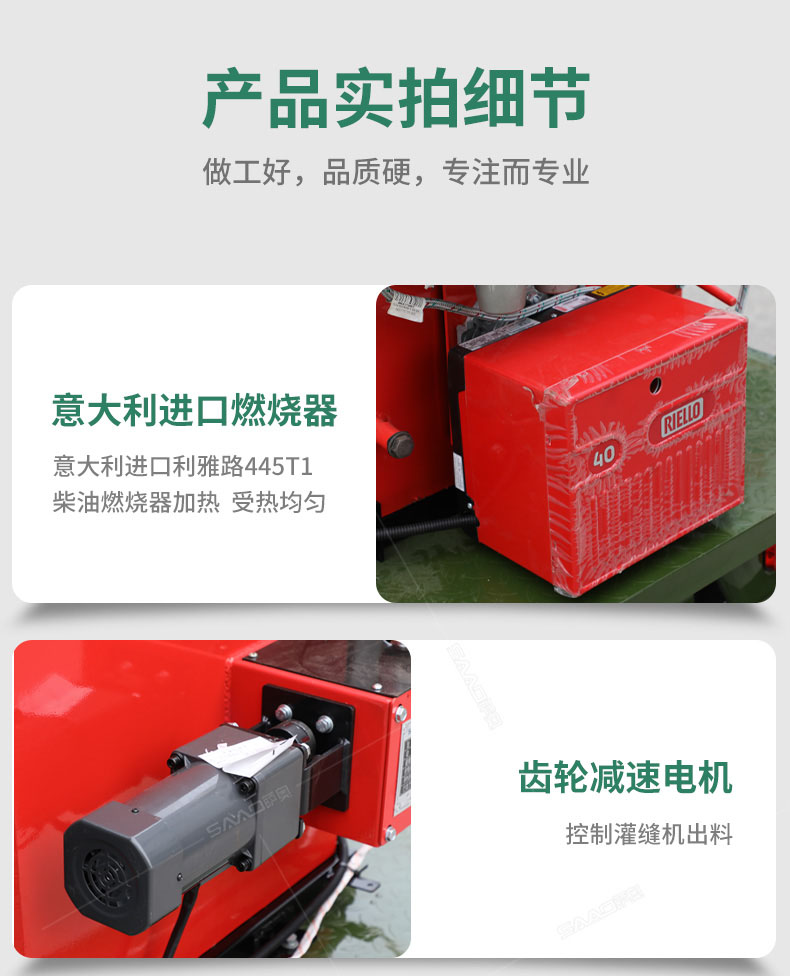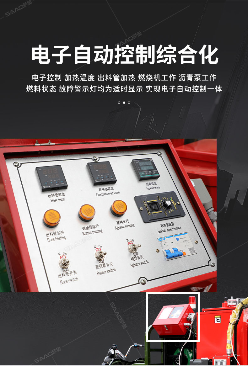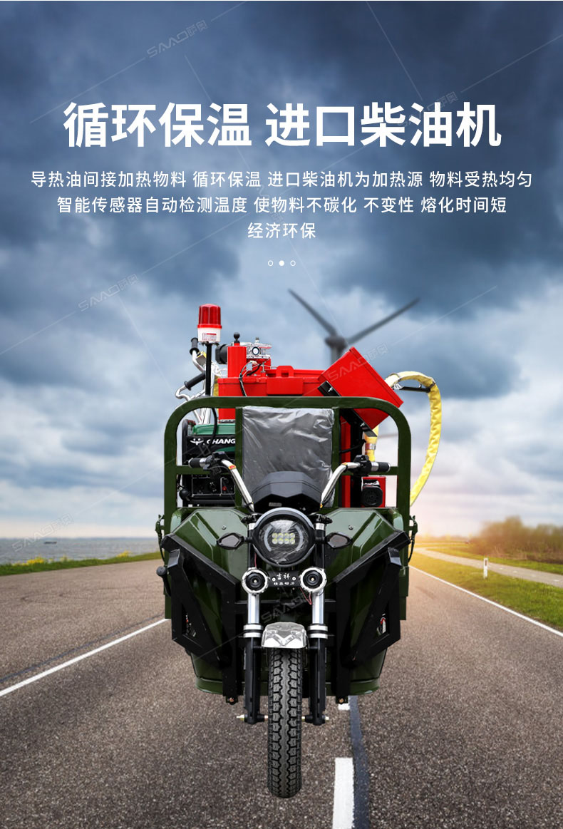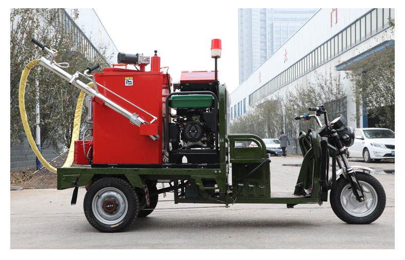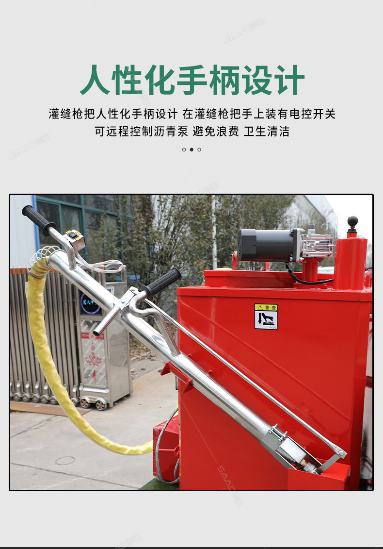 汽油灌縫機主要有手推式和自行式手持灌縫管操作,采用進口柴油燃燒器加熱。在工作時首先在料箱內加入瀝青或灌縫膠,啟動發(fā)電機供電,依次間斷打開導熱油泵開關,燃燒器開關,出料管加熱開關;調整自動溫控系統(tǒng)與材料的溫度相同,通過柴油燃燒器自動加熱熔料箱內導熱油開始升溫(拖式為強制循環(huán))使材料融化,溫度是通過自控系統(tǒng)來控制。溶料時間大約30-40分鐘左右。在材料融化、出料管溫度達到后可以進行工作。手持灌縫管對正裂縫灌縫處理。瀝青泵的出料流量可調。在工作過程中隨時添加材料保證工作的連續(xù)性。