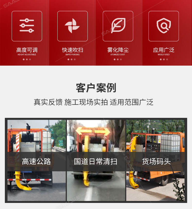 車載路面吹風(fēng)機(jī)針對(duì)目前高速公路路邊角清掃困難而生產(chǎn)的一款路面清掃設(shè)備,具有快速、高效、低能耗、低工作強(qiáng)度等優(yōu)點(diǎn)