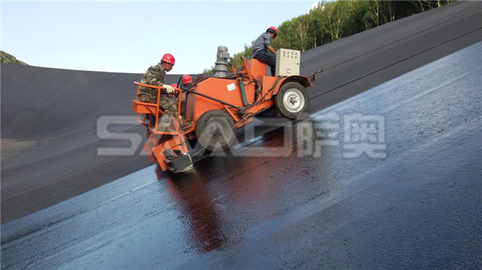 瀝青封閉層的施工采用適合于斜坡施工的專用瀝青瑪蹄脂涂刷機,在牽引臺車的牽引下沿著面板從下往上涂刷。涂刷完一個條帶后,將涂刷機移動至下一個條帶繼續(xù)涂刷?,斕阒忾]層涂刷作業(yè)時環(huán)境氣溫應在10℃以上,涂刷溫度一般在170℃~190℃;施工完成的封閉層表面禁止無關人員和機械行走;特殊部位:壩頂及曲率半徑較小的圓弧斷,采用小型機械涂刷方式進行機械涂刷進行,環(huán)庫水平段及弧段全部采用小刮涂機配合人工進行刮涂施工。