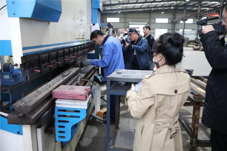 圖/韓總親自給采訪團(tuán)介紹數(shù)控折彎機(jī)的神奇之處