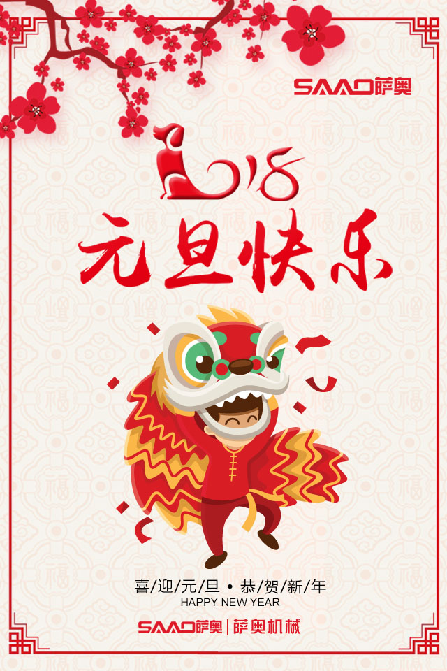 值此元旦來(lái)臨之際,再次衷心地感謝所有支持薩奧機(jī)械發(fā)展的各位領(lǐng)導(dǎo)、各界朋友的厚愛,感謝國(guó)內(nèi)外新老客戶對(duì)薩奧機(jī)械長(zhǎng)期以來(lái)的信任,感謝薩奧家人們多年來(lái)的理解與支持!祝愿大家元旦快樂、工作順利、心想事成!