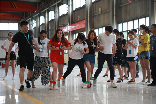 游戲---三人兩足。選出24個(gè)人,分成4組,各組選出一個(gè)組長來制定總的比賽方案。每組6人站成一排,將相鄰的兩人的腳綁在一起行走,在固定的路程內(nèi)計(jì)算行走時(shí)間。每兩個(gè)組之間比較,用時(shí)少者勝出。