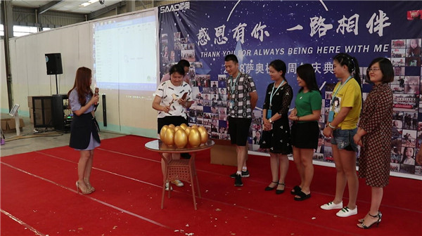 很多時(shí)候都不得不感慨一句,薩奧真的是人才濟(jì)濟(jì)。既然是周年典慶,那么才藝表演自然少不了。在一輪又一輪的才藝表演過后,接下來就展開了砸金蛋的環(huán)節(jié)。桌上放著10個(gè)金蛋,每個(gè)金蛋里都放了數(shù)額不同的人民幣,選出10個(gè)表現(xiàn)好的員工,依次砸金蛋,砸哪個(gè)金蛋,哪個(gè)金蛋里的錢就屬于自己。是不是很好玩???