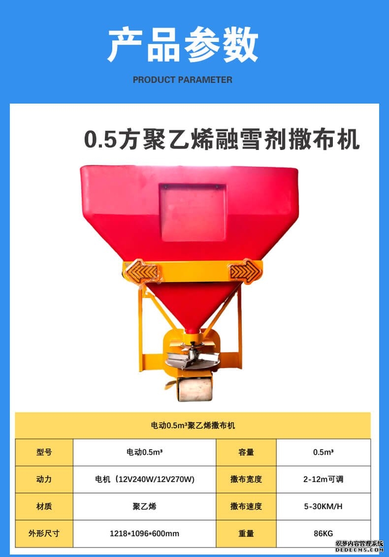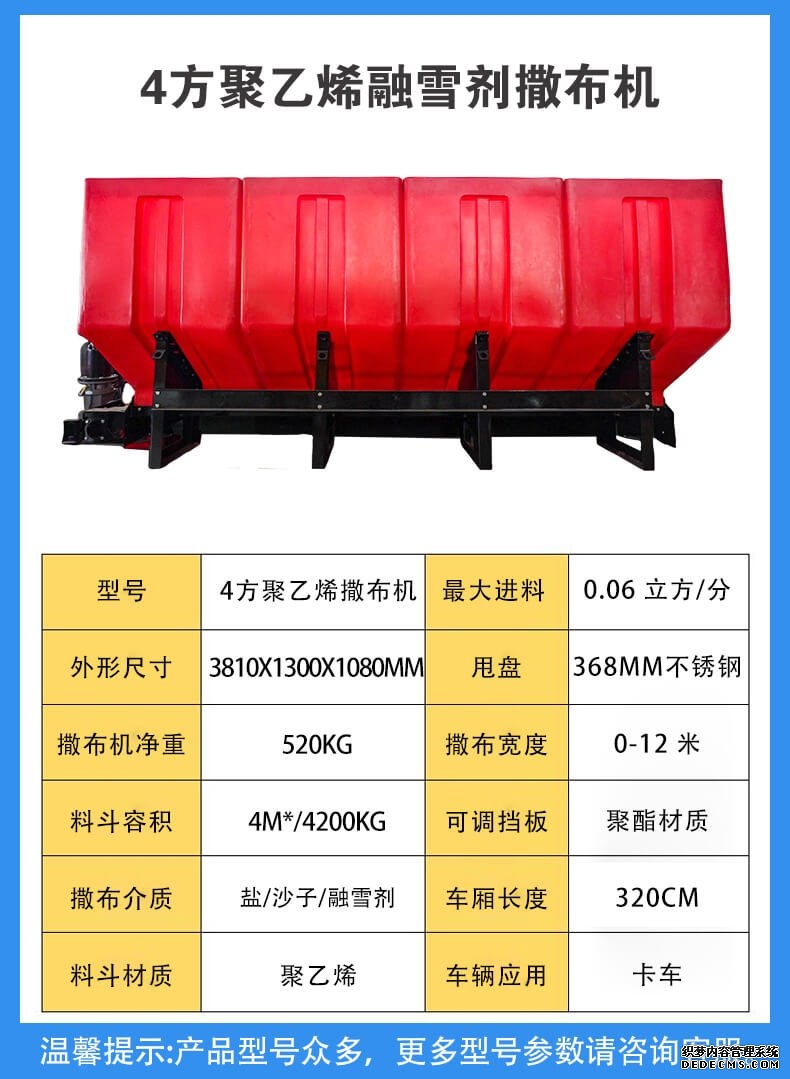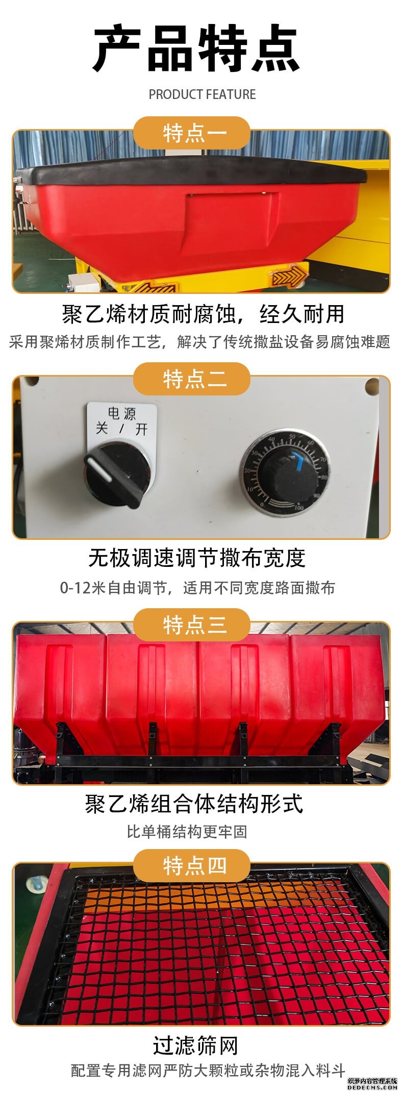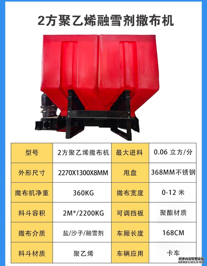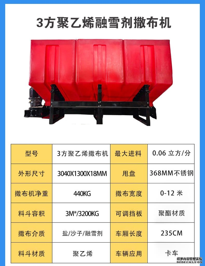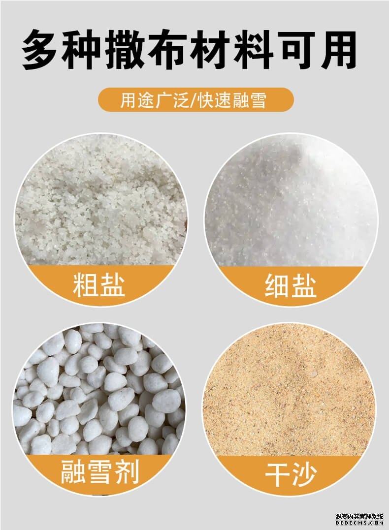 融雪劑撒布機(jī)是車載式撒布機(jī),適用于冰雪路面防滑沙料和融雪劑的撒布,是市政公路、高速公路的融雪撒布的便利設(shè)備。