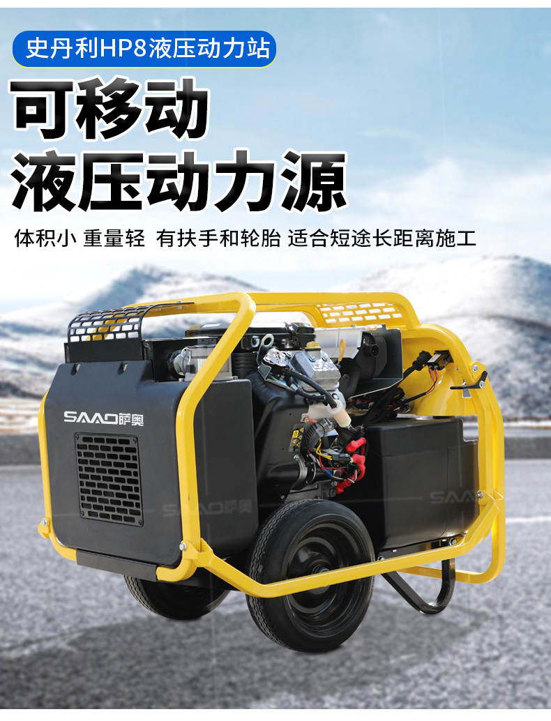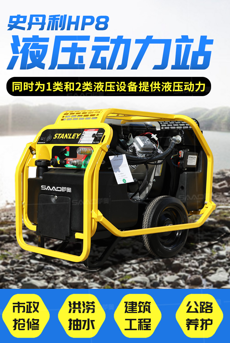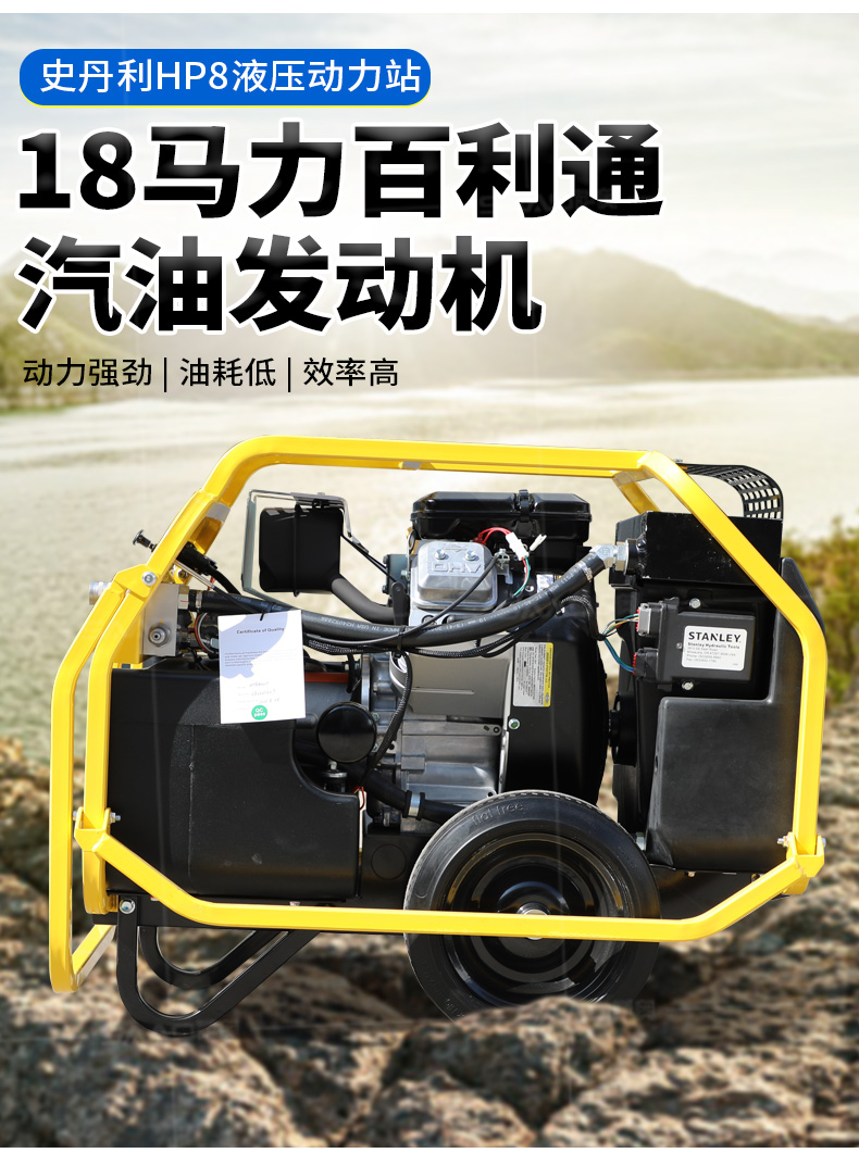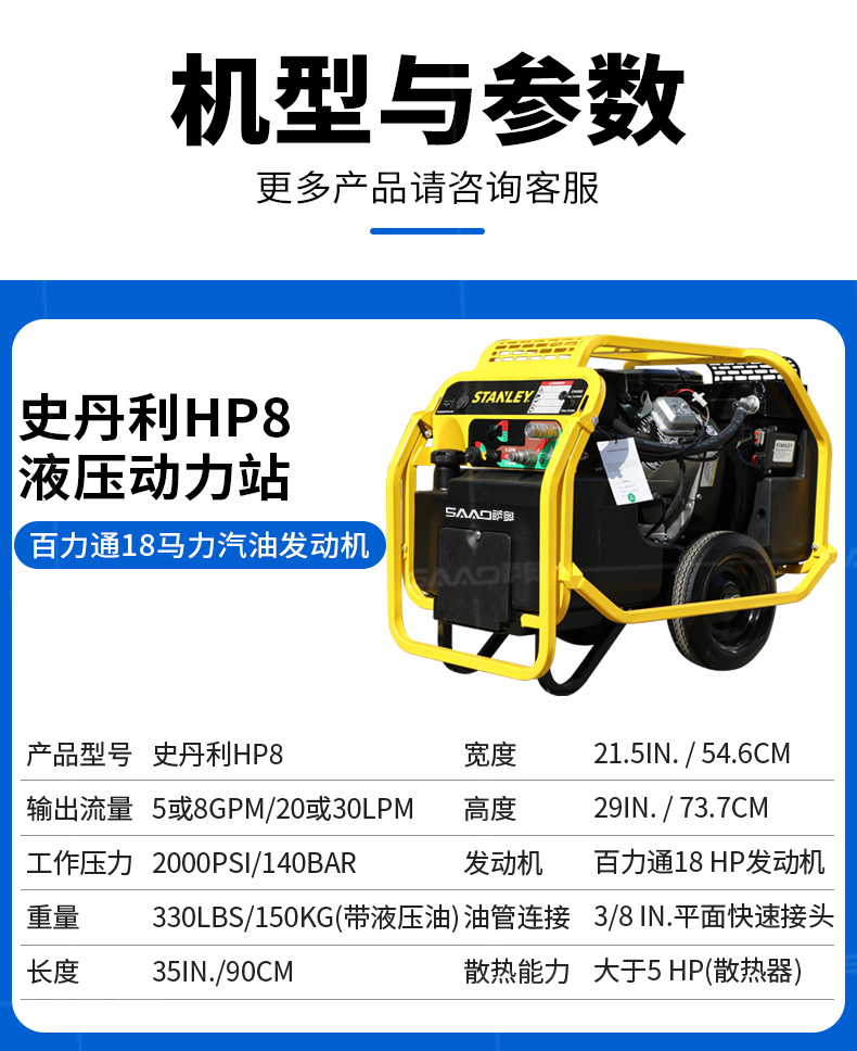 HP8動力站是為液壓設(shè)備提供持續(xù)動力的,它同時滿足1類和2類液壓設(shè)備。它采用百力通18馬力 汽油發(fā)動機,有良好的液壓油散熱系統(tǒng),以滿足液壓設(shè)備可以正常、持久地工作。