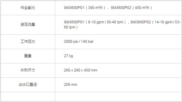 SM3600P01是一款大排量的8寸手提式液壓水泵。由于其體積小、重量輕,易搬運等特點??膳c18hp功率或以上的可移動液壓動力站配合組成多用途移動泵站系統(tǒng),廣泛用于大流量供排水、應急搶險救災排水等特殊場合。