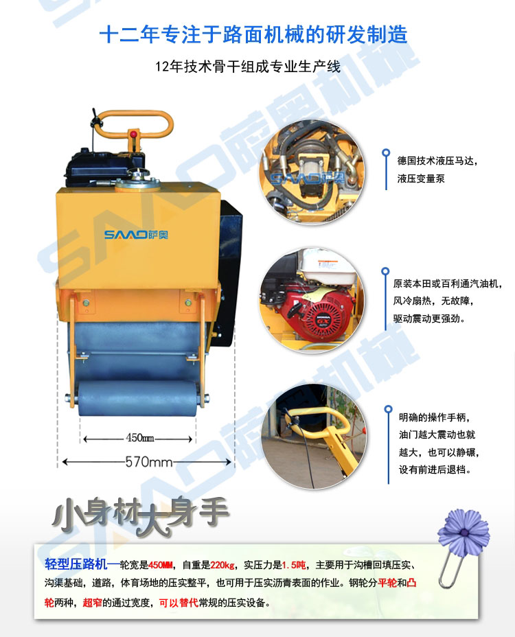 概述: 主要用于溝渠基礎,道路,體育場地的壓實整平,也可用于壓實瀝青表面的作業(yè)。